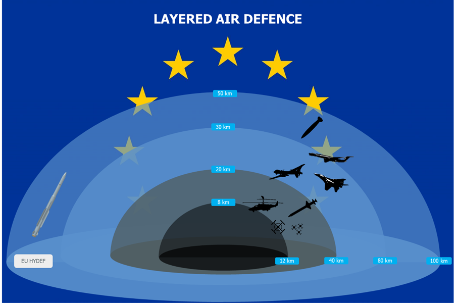 The HYDEF project will develop a European interceptor targeting the 2035+ threats, weapon and sensor systems. The project will result in the concept of a cost-effective endo-atmospheric interceptor able to operate in different air levels encompassing new aerodynamic and actuator system for high maneuverability, highly agile guidance concepts, and advanced sensor/seeker systems.